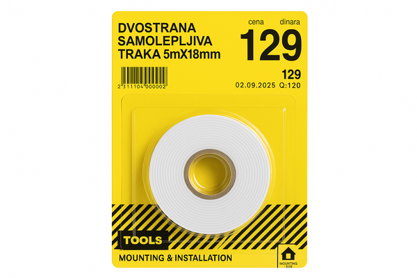 Visokokvalitetna dvostrana samolepljiva traka dimenzija 5m x 18mm, idealna za montažu različitih predmeta bez potrebe za bušenjem ili korišćenjem vijaka. Ova profesionalna traka omogućava čvrsto i dugotrajno lepljenje.