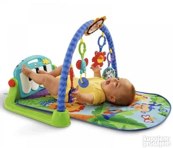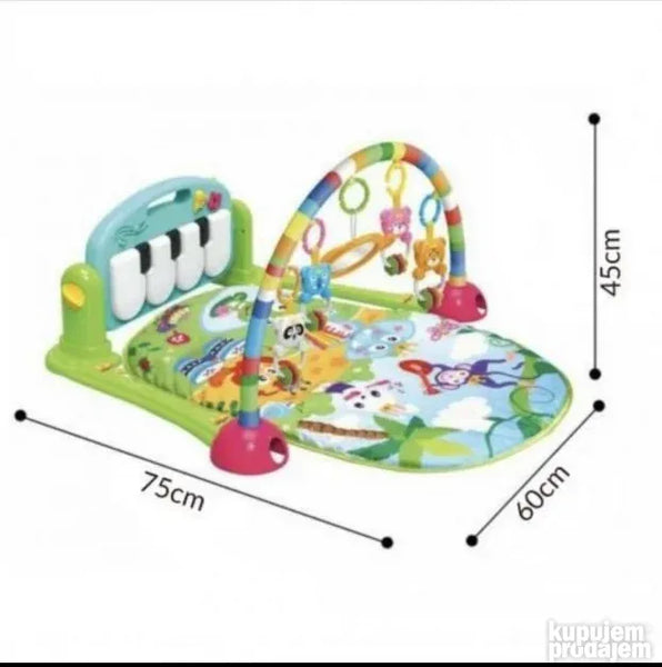 Multifunkcionalna muzička fitnes bebi gimnastika za igru uključuje muzički piano bebi ogledalo za samoupoznavanje i 4 šarene igračke sa prstenovima koje vise na postolju.